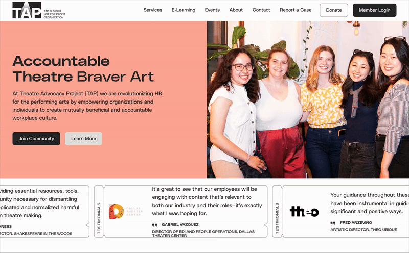 Theatre Advocacy Project is a nonprofit providing human resources tools, support, and infrastructure for people working in theatre and performance art, an industry where HR is often overlooked or nonexistent. With 85% of professional theatres lacking formal HR structures and only 6% of artists having a safe way to report harm, TAP fills a critical gap. While their mission was powerful and their track record strong, the brand hadn’t evolved in years and was struggling to keep pace with the movement it was leading.